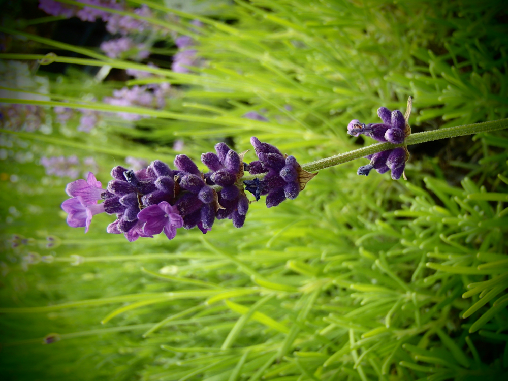 Wuchshöhe bis 50 cm, wie Hidcote blue nur größer und breiter, stecklingsvermehrt, grau-grünes Laub