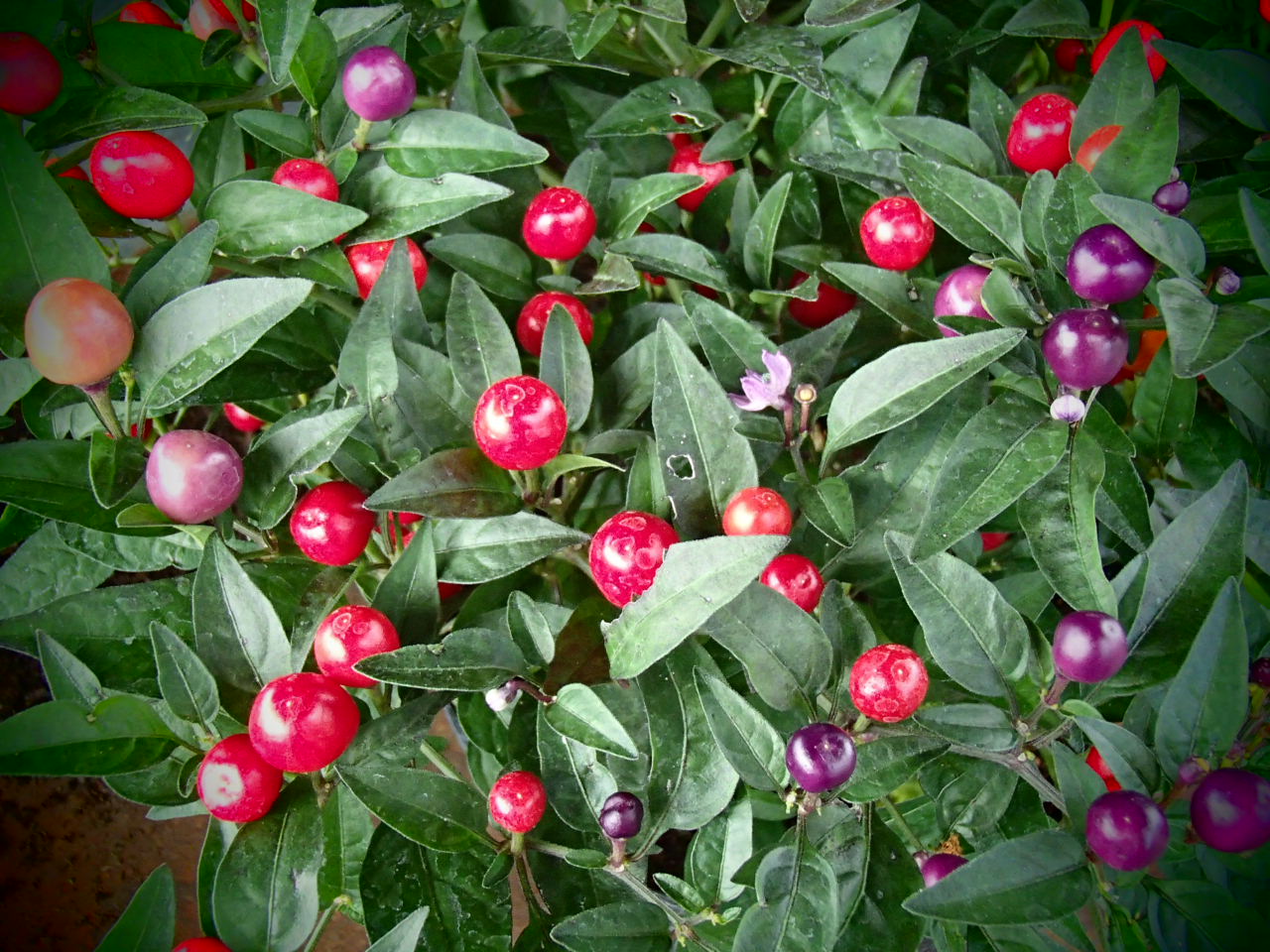 Kleine aufrecht stehende fast runde Früchte, violette Blüten, auch als sehr schöne Kübelpflanze zu kultivieren