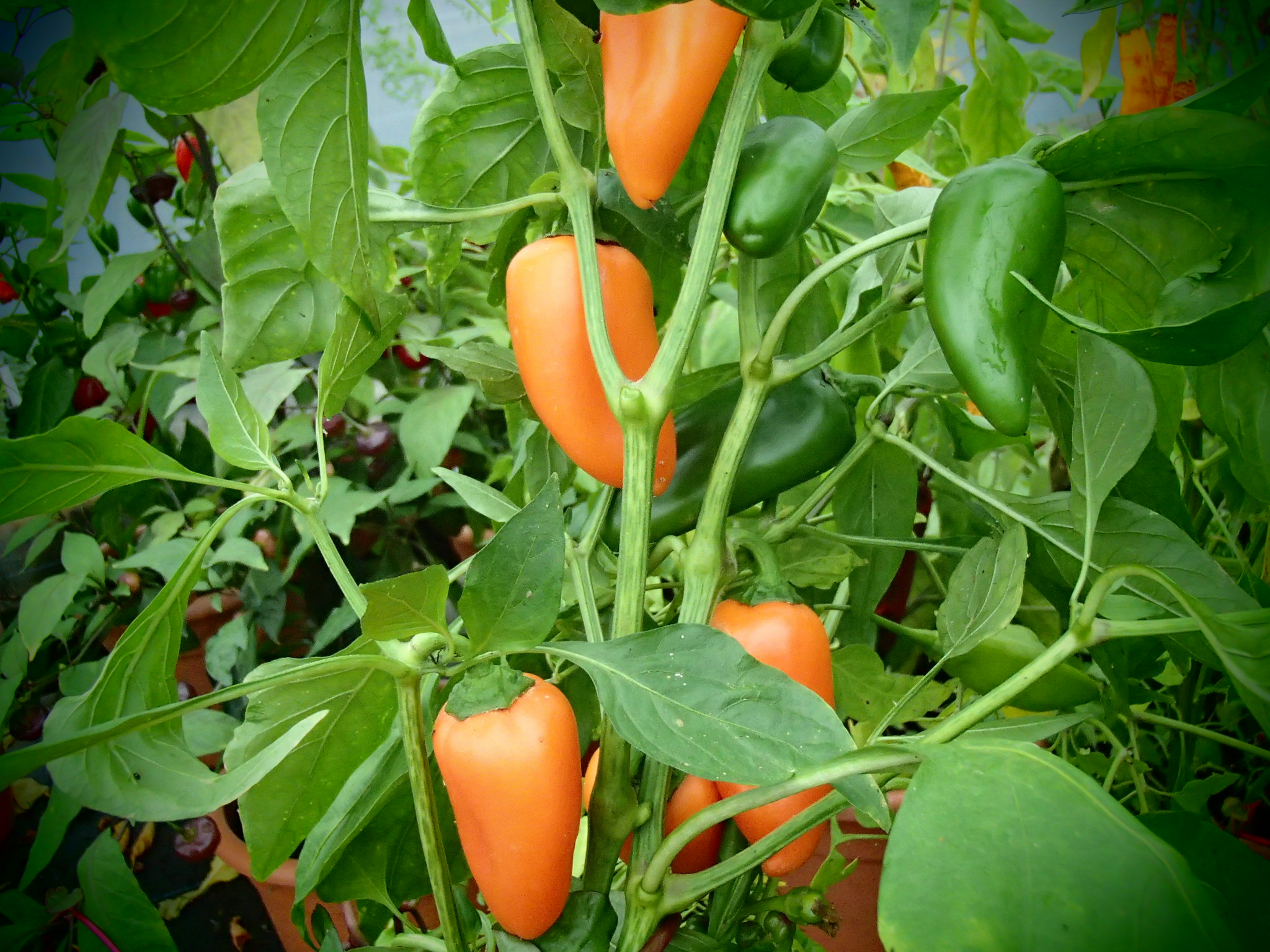 Snackpaprika mit leuchtend orangen, 5 - 7 cm langen Früchten. Knackig und süss, wenig Samen.